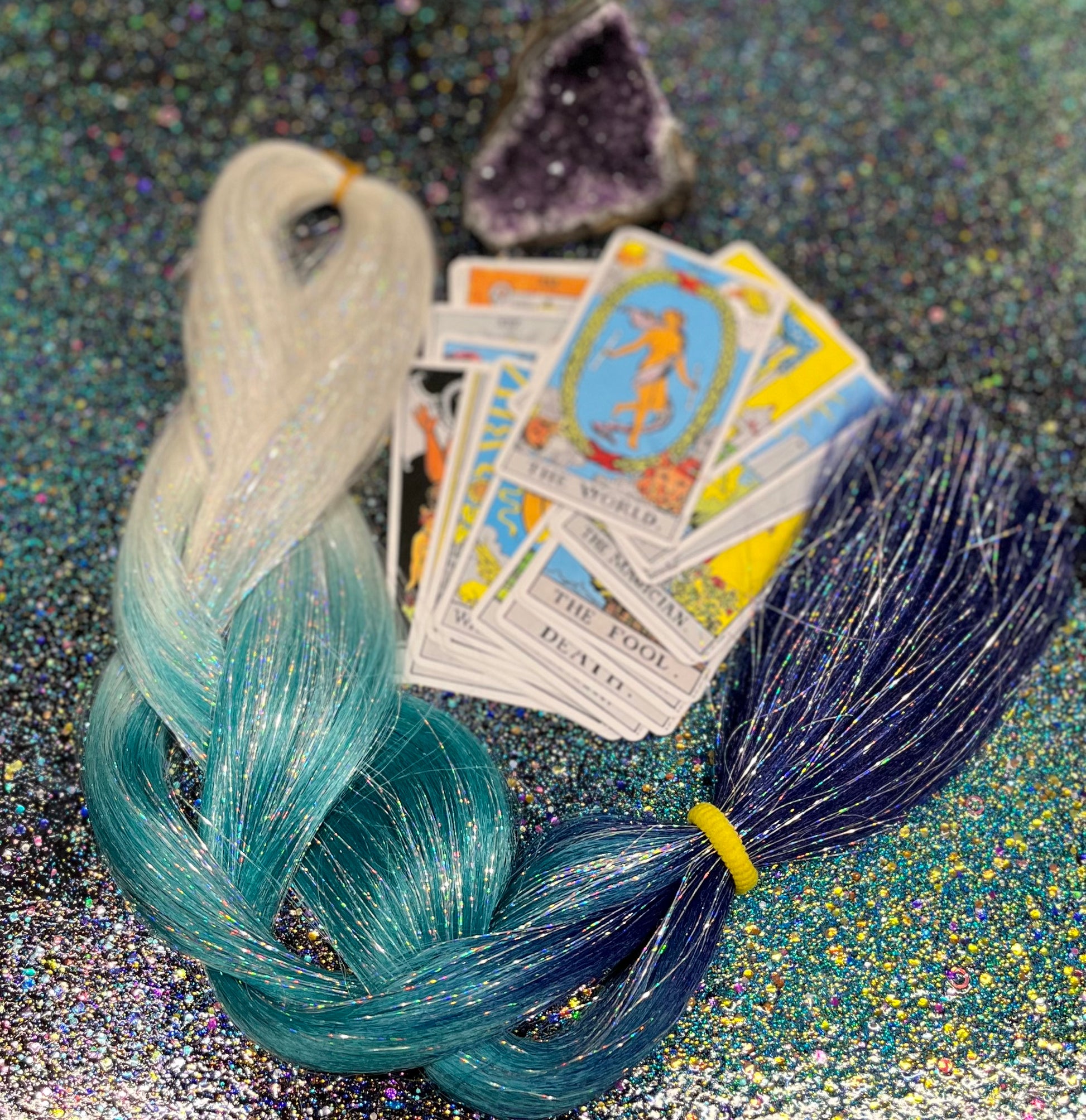 Creamy, cool blonde to teal iNto deep blue with silver tinsel.