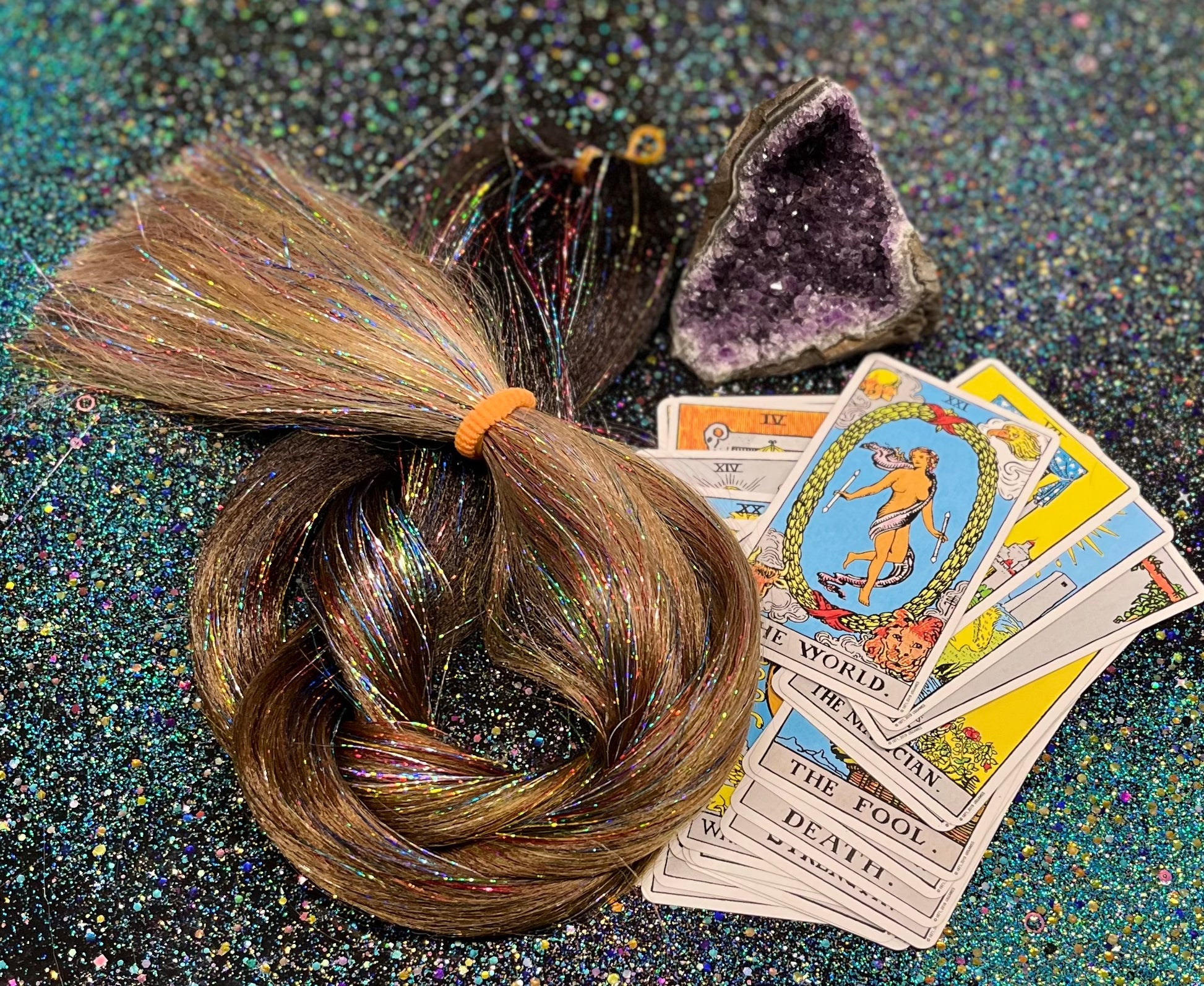 Deep brown to light brown to dark blonde with rainbow tinsel.